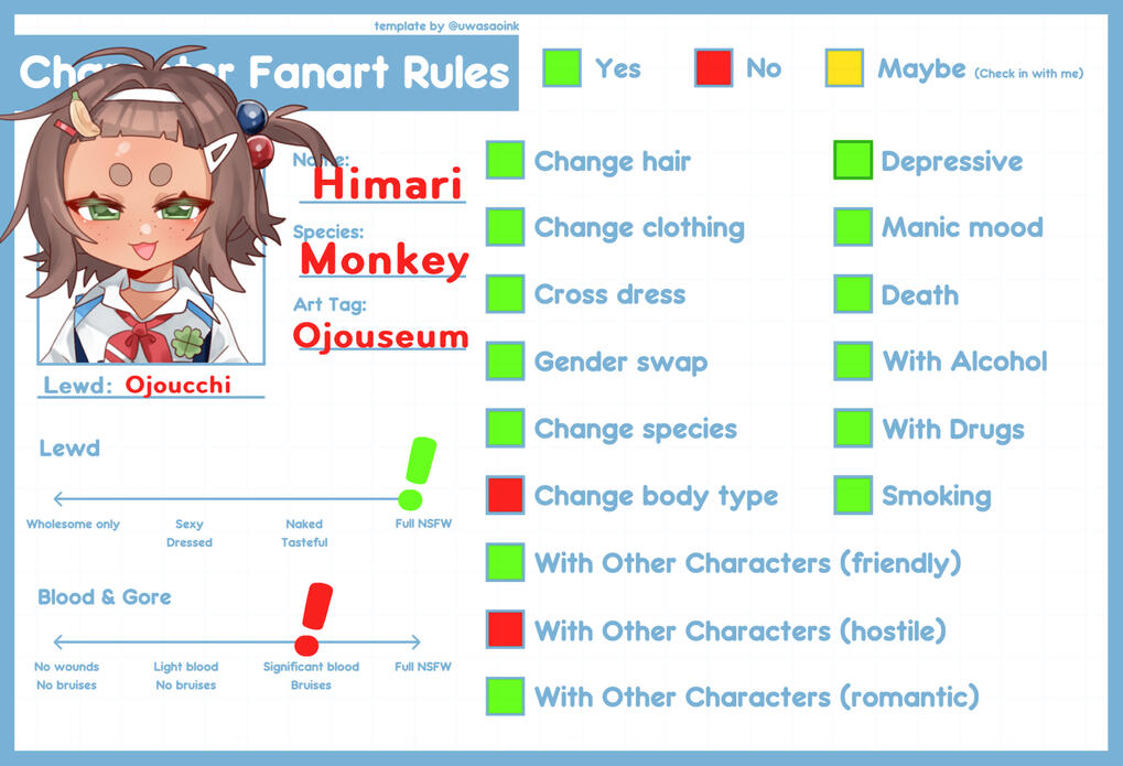 NO blacked, futa, scat, gas in any form, guro/gore, heavy ryona, extreme violence, diaper fur, diaper piss / diapers in general, and super muscular stuff (it scares me a little)